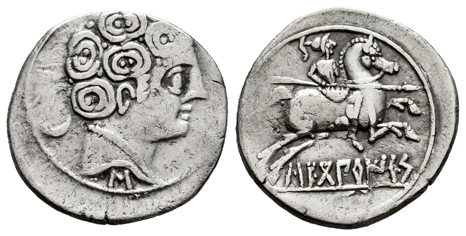 Sekobirikes. Denarius. 120-30 BC. Saelices (Cuenca). (Abh-2168). (MIB-125/01). Anv.: Male head right, crescent behind and iberian letter S below. Rev.: Horseman right, holding spear (only one foot visible), iberian legend SEKOBIRIKES below. Ag. 3,56 g. Minor nick on reverse. Ex Tauler&Fau 149 (01/10/2024), lot 2338. VF/Choice VF. Est...120,00.