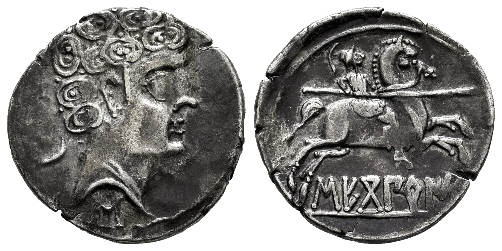 Sekoberikes. Denarius. 120-30 BC. Saelices (Cuenca). (Abh-2169). (MIB-125/2b). (Tesorillo-Sekobirikes 40, Plate Coin). Anv.: Male head right, crescent and pellet behind, iberian letter S below. Rev.: Horseman right, holding spear (only one foot visible), iberian legend SEKOBIRIKES below. Ag. 3,22 g. Slight patina. Ex Tesorillo Vol. I, lot 437. Choice VF. Est...150,00.