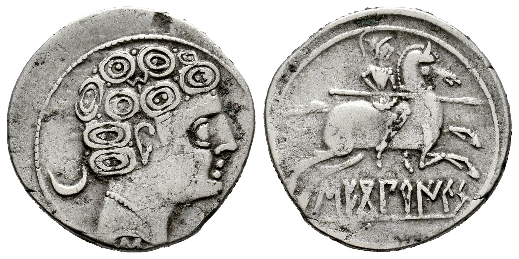 120-30 a.C. Anv.: Cabeza masculina a derecha, detrás creciente y debajo letra ibérica S. Rev.: Jinete con lanza a derecha asomando dos pies, debajo leyenda ibérica SEKOBIRIKES. 3,50 g. 8-curls hairstyle. Sign in the hairstyle. Est...150,00.