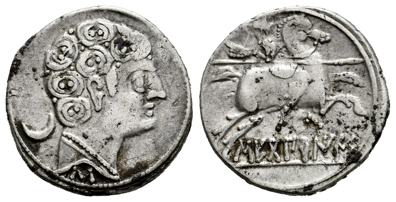Sekobirikes. Denarius. 120-30 BC. Saelices (Cuenca). (Abh-2174). (MIB-125/09a). (Acip-1875). Anv.: Male head right, crescent behind and iberian letter S below. Rev.: Horseman right with chlamys (both feet visible), iberian legend SEKOBIRIKES below. Ag. 3,97 g. 6-curls hairstyle. Slight deposits. Choice VF/VF. Est...150,00.
