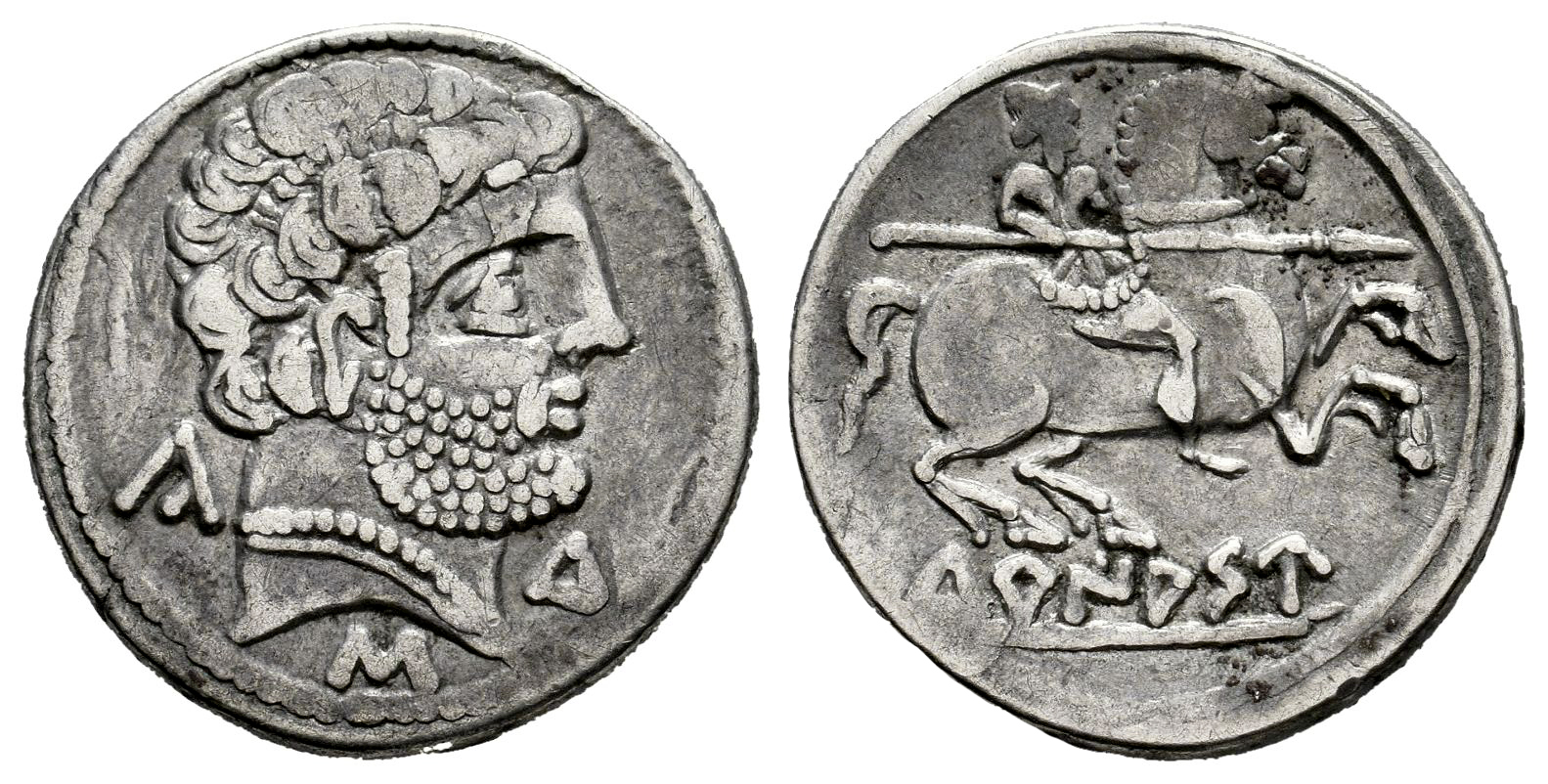 Turiasu. Denarius. 120-20 BC. Tarazona (Zaragoza). (Abh-2417). (MIB-109/23a). Anv.: Bearded head right, iberian letter KA, S and TU. Rev.: Horseman right, holding spear, iberian legend TURIASU below. Ag. 3,95 g. VF. Est...150,00.