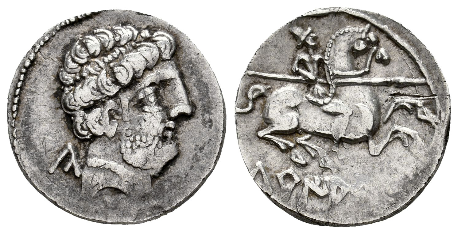 Turiasu. Denarius. 120-20 BC. Tarazona (Zaragoza). (Abh-2417). (MIB-109/24). Anv.: Bearded head right, iberian letter KA, S and TU. Rev.: Horseman right, holding spear, iberian legend TURIASU below. Ag. 3,10 g. Tarces of mounting. Scratch on reverse. VF/Choice VF. Est...100,00.