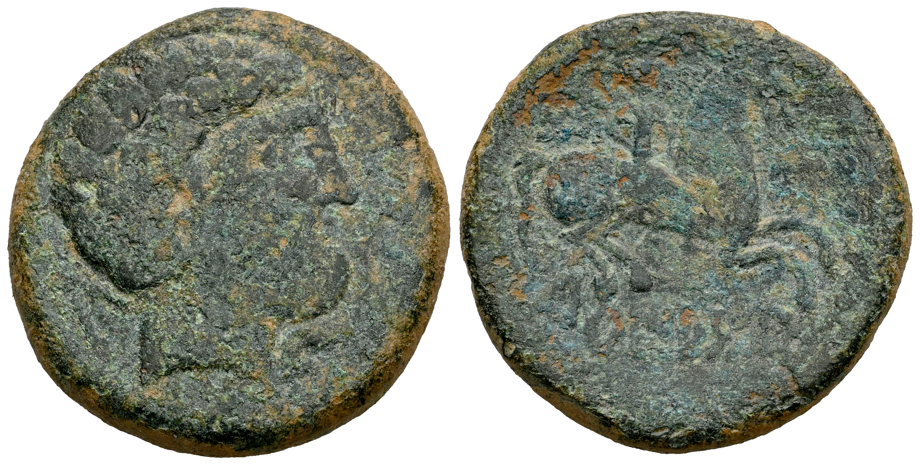Turiasu. Unit. 120-20 BC. Tarazona (Zaragoza). (Abh-2424). (Acip-1708). Anv.: Bearded head, iberian letter KA behind, dolphin before. Rev.: Horseman right, holding spear, iberian legend TURIASU below. Ae. 12,65 g. Choice VF. Est...100,00.