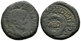 Turiaso. Augustus period. Half unit. 27 BC - 14 AD. Tarazona (Zaragoza). (Abh-2457). (Acip-3287). Anv.: TI. AVGVSTVS. AVGVSTI. F. IMP. around laureate head of Tiberius right. Rev.: AED within laurel wreath, (MARIO.) VEGE. LICI. CRES. (MVN. TVRIASO) around. Ae. 4,04 g. Scarce. F/Choice F. Est...45,00.