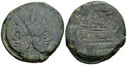 Anonymous. Unit. 169-158 BC. Rome. (Craw-183/1). (Sydenham-297). (RBW-775). Anv.: Laureate head of bearded Janus; I (mark of value) above. Rev.: Prow of galley to right; above, she-wolf standing to right, head to left, suckling the twins Romulus and Remus; I (mark of value) to right, (R)OM(A) below. Ae. 23,51 g. VF. Est...120,00.
