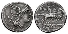 Anonymous. Quinarius. 211-209 BC. Rome. (Craw-44/6). (Bmcre-Rome 9). (Rsc-3). Anv.: Helmeted head of Roma to right; V behind. Rev.: Dioscuri on horseback riding to right; below, ROMA in linear frame. Ag. 2,25 g. Choice VF. Est...120,00.