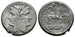 Anonymous. Didrachm - quadrigatus. 225-214 BC. Rome. (Craw-31/1). (Rsc-23a). Anv.: Laureate head of Janus; pellet below. Rev.: Jupiter standing in galloping quadriga driven to right by Victory, holding sceptre and reins, brandishing thunderbolt overhead; ROMA incuse on tablet below. Ag. 6,52 g. Sharp and well-centered struck. Nice tone with light iridiscent hues. Almost XF. Est...700,00.