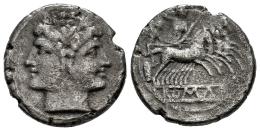 Anonymous. Quadrigatus. 225-214 BC. Rome. (Craw-28/3). (BMCRR Romano-Campanian-101/106). (Rsc-24). Anv.: Laureate head of Janus. Rev.: Jupiter standing in galloping quadriga driven by Victory to right, holding sceptre and reins, brandishing thunderbolt overhead; ROMA in tablet below. Ag. 5,35 g. Lightly toned. Almost VF. Est...200,00.
