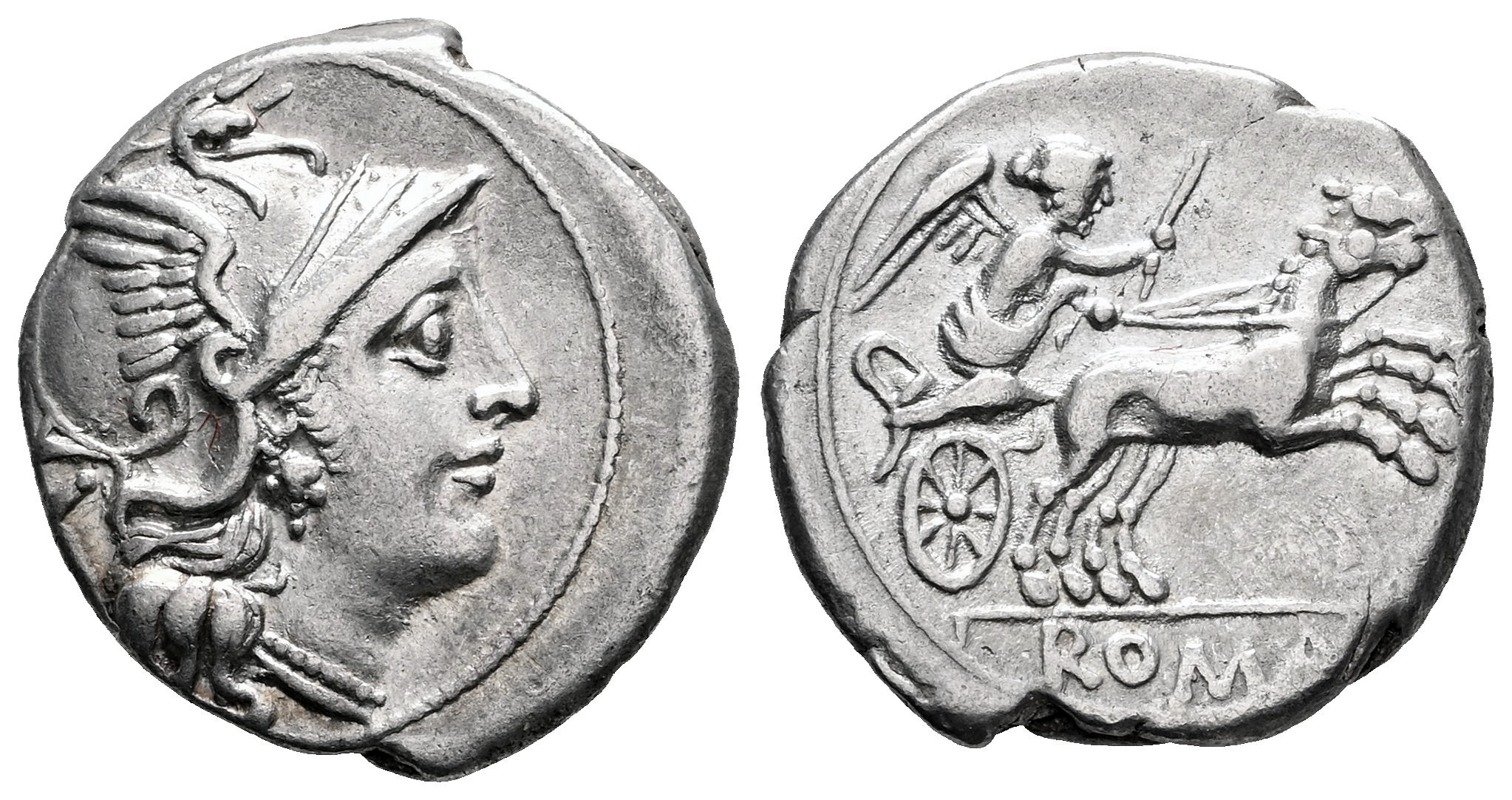 Anonymous. Denarius. 157-156 BC. Rome. (Ffc-77). (Craw-197/1). (Cal-52). Anv.: Head of Roma right, X behind. Rev.: Victory holding whip, in bigra right, ROMA in exergue. Ag. 3,56 g. Displaced struck. Choice VF. Est...90,00.