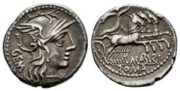 Aburius. Denarius. 132 BC. Rome. (Ffc-88). (Craw-250/1). (Cal-60). Anv.: Head of Roma right, GEM behind, X below chin. Rev.: Sol holding whip in quadriga right, M. ABVRI, (interlace AB and VR), below, ROMA in exergue. Ag. 3,78 g. Slight patina. Choice VF/VF. Est...100,00.