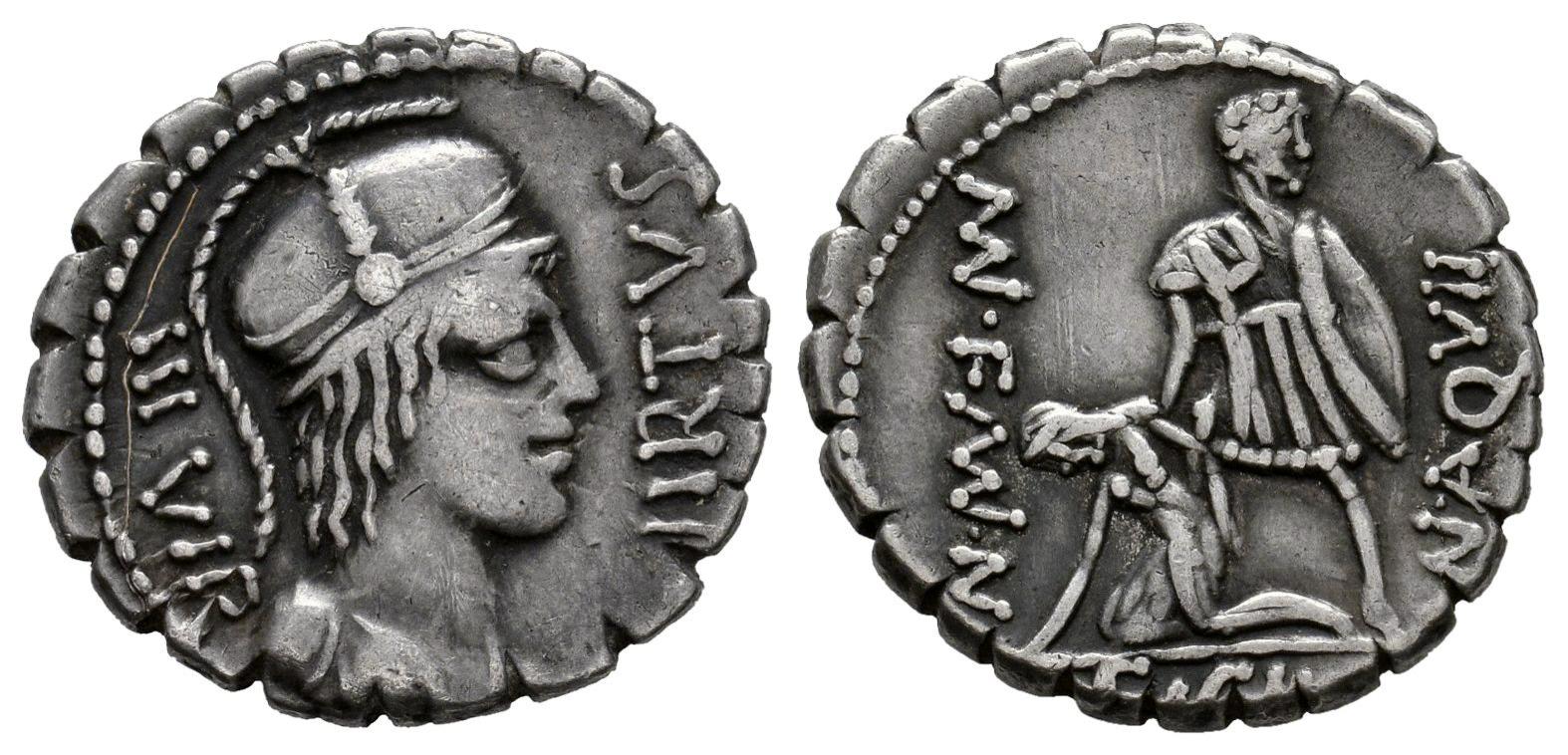 Aqullius. Manius Aquilius Mn.f.Mn.n. Denarius. 71 BC. Uncertain mint. (Ffc-167). (Craw-401/1). (Cal-230). Anv.: VIRTUS III . VIR or (IIIVIR), helmeted bust of Virtus right. Rev.: MN. AQVIL. MN. F. MN. N., (MN-MN-MN interlace), the consul Man. Aquillius raising Sicilia, (SICIL), in exergue. Ag. 3,79 g. Scratch on obverse. Lightly toned. Choice VF. Est...150,00.