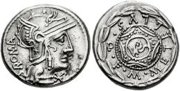 Caecilius. M. Caecilius Metellus Q.f. Denarius. 127 BC. Rome. (Ffc-205). (Craw-263/1a). (Cal-281). Anv.: Head of Roma right, but with star on helmet ROMA upwards behind, X below chin. Rev.: M. METELLVS Q. F., around Macedonian shield on which elephant’s head, all in laurel-wreath. Ag. 3,94 g. Slight obverse deposits. Slightly cleaned. Ex H.D Rauch 96 (10/12/2014), lot 161. Almost XF/Choice VF. Est...180,00.