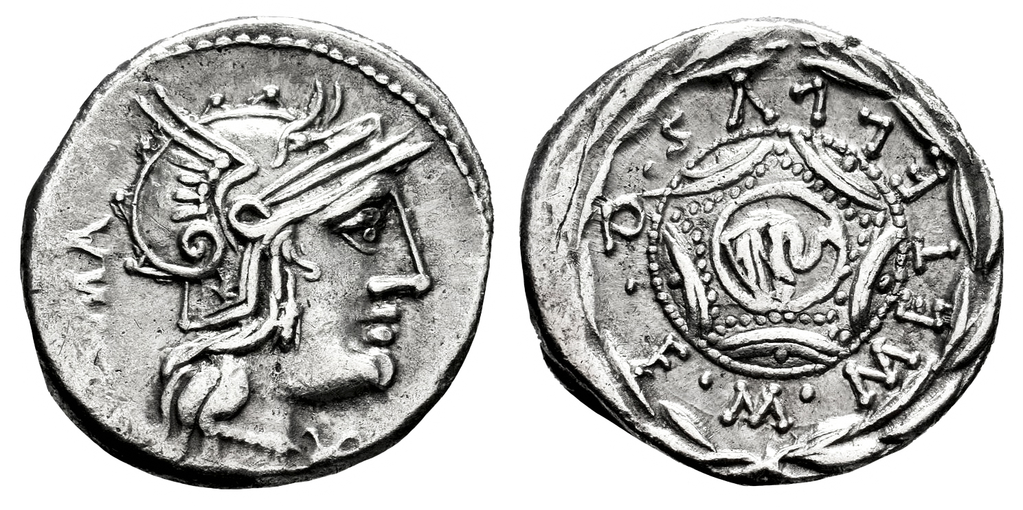Caecilius. M. Caecilius Metellus Q.f. Denarius. 127 BC. Rome. (Ffc-205). (Craw-263/1a). (Cal-281). Anv.: Head of Roma right, but with star on helmet ROMA upwards behind, X below chin. Rev.: M. METELLVS Q. F., around Macedonian shield on which elephant’s head, all in laurel-wreath. Ag. 3,88 g. Slight cleaning. Choice VF. Est...150,00.