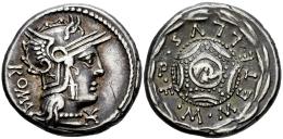 Caecilius. M. Caecilius Metellus Q.f. Denarius. 127 BC. Rome. (Ffc-206). (Craw-263/1b). (Cal-282). Anv.: Head of Roma right, with star on helmet, but ROMA downwards behind, X below chin. Rev.: M. METELLVS Q. F., around Macedonian shield on which elephant’s head, all in laurel-wreath. Ag. 3,92 g. Beautiful tone. Ex Bremens Belleville & Maison Creusy (27/12/2014). Almost XF. Est...180,00.