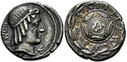 Caecilius. M. Caecilius Metellus Q.f. Denarius. 82-80 BC. Rome. (Ffc-207). (Craw-369/1). (Cal-283). Anv.: Diademed head of Apollo right, ROMA behind, X below chin. Rev.: M. METELLVS Q. F., around Macedonian shield on which elephant’s head, all in laurel-wreath. Ag. 3,85 g. Delicate patina with a beautiful iridiscent tone. Rub on the cheek and two minor scratches. Choice VF. Est...250,00.