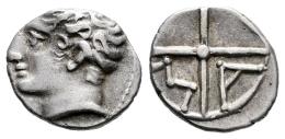 Galia. Massalia. Obol. 336-310 BC. (Sng Cop-723/27). (Maurel-360). Anv.: Bare head of Apollo to left. Rev.: M-A within wheel of four spokes. Ag. 0,63 g. Choice VF. Est...75,00.