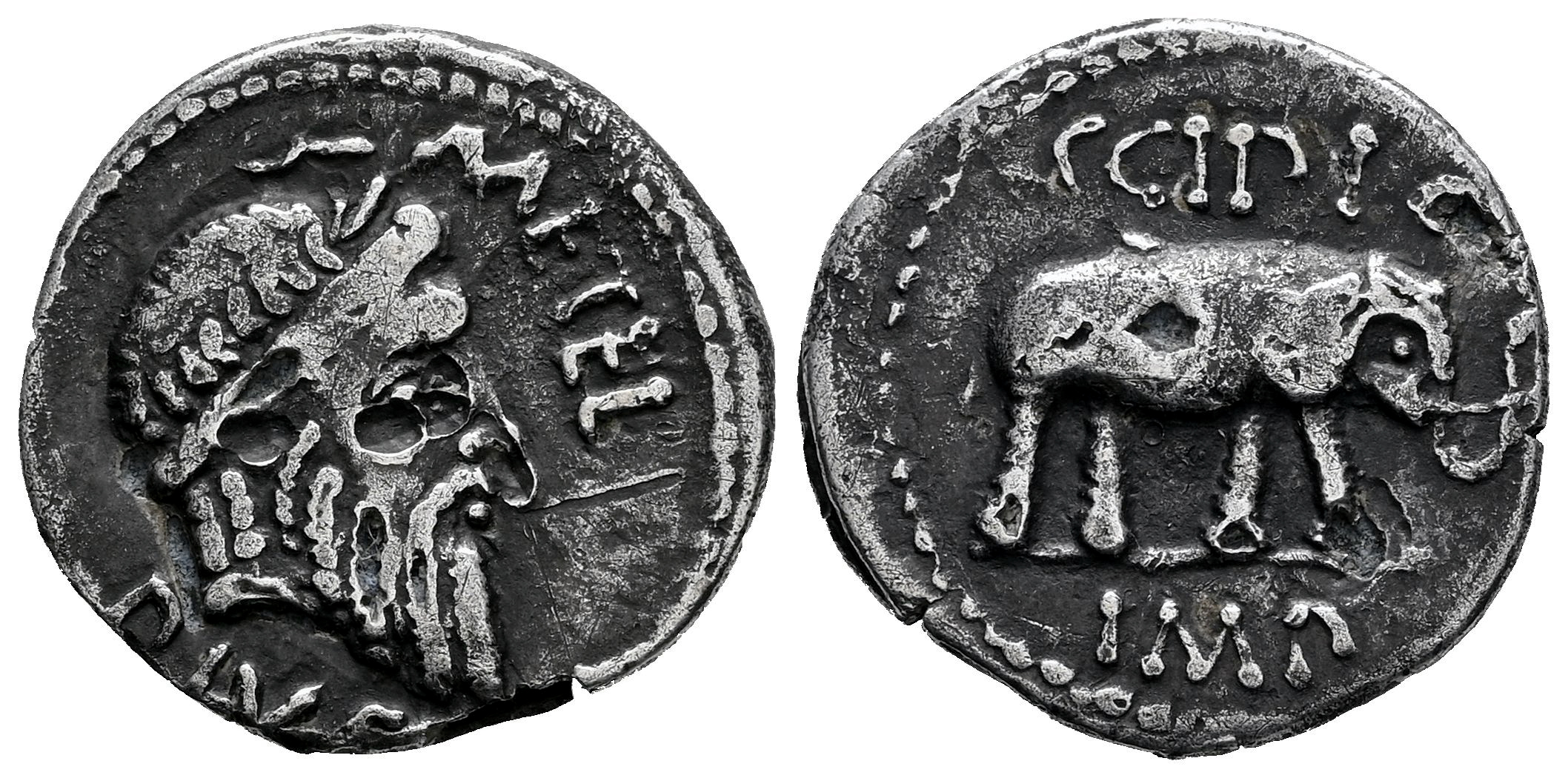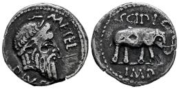 Caecilius. Fourée Denarius. 47-46 BC. Africa. (Ffc-220). (Craw-459/1). (Cal-295). Anv.: Q. METEL. PIVS., laureate head of Jupiter. Rev.: Elephant right, SCIPIO, above, IMP. in exergue. Ae/Ar. 2,81 g. Punch marks. Almost VF. Est...80,00.