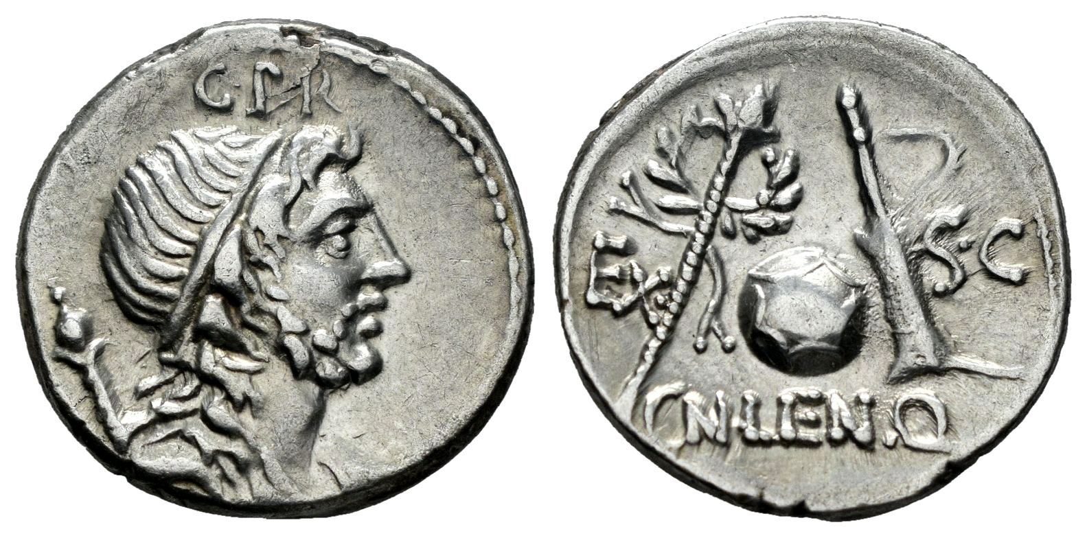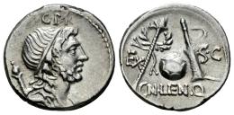 Cornelius. Cn Cornelius Lentulus Marcellinus. Denarius. 76-75 BC. Hispania. (Ffc-626). (Craw-393/1a). (Cal-486). Anv.: G. P. R. above diademed bust of the Genius of the Roman People draped right, sceptre on shoulder. Rev.: EX. S.C. divided by terrestrial globe between rudder and sceptre, CN. LEN. Q. below. Ag. 3,89 g. Almost XF/Choice VF. Est...180,00.