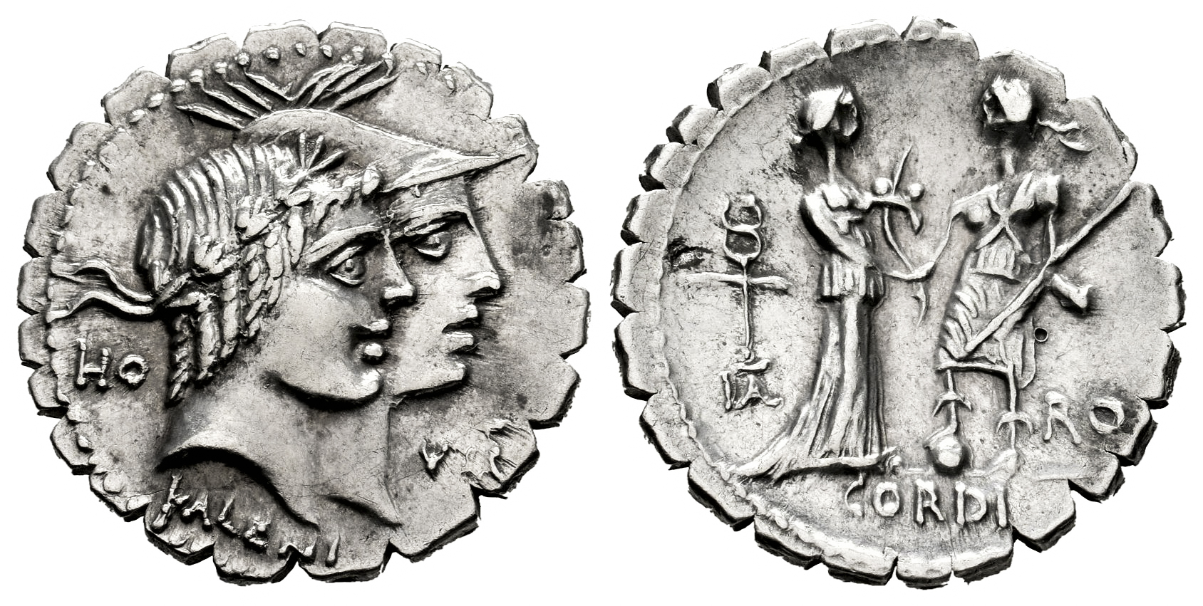 Fufius. Q. Fufius Calenus y Mucius Cordus. Denarius. 70 BC. Rome. (Ffc-725). (Craw-403/1). (Cal-595). Anv.: KALENI below jugate heads of Honos and Virtus, the former is laureate and the latter wears helmet, HO., behind, VIRT., (RT interlace), before. Rev.: Italia on left and Roma on right, clasping hands, between clasped hands, comucopiae, behind Italia, caducous, Roma wears diadem, holds fasces in left hand and places right foot on globe, RO on right, ITAL., (monogram) on Ieft. CORDI. in exergue. Ag. 3,99 g. Magnificent piece. Strong and centered strike, retaining traces of original luster. A tiny punch mark on the reverse, made by merchants, confirms its authenticity. Scarce in this condition. XF/AU. Est...400,00.