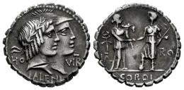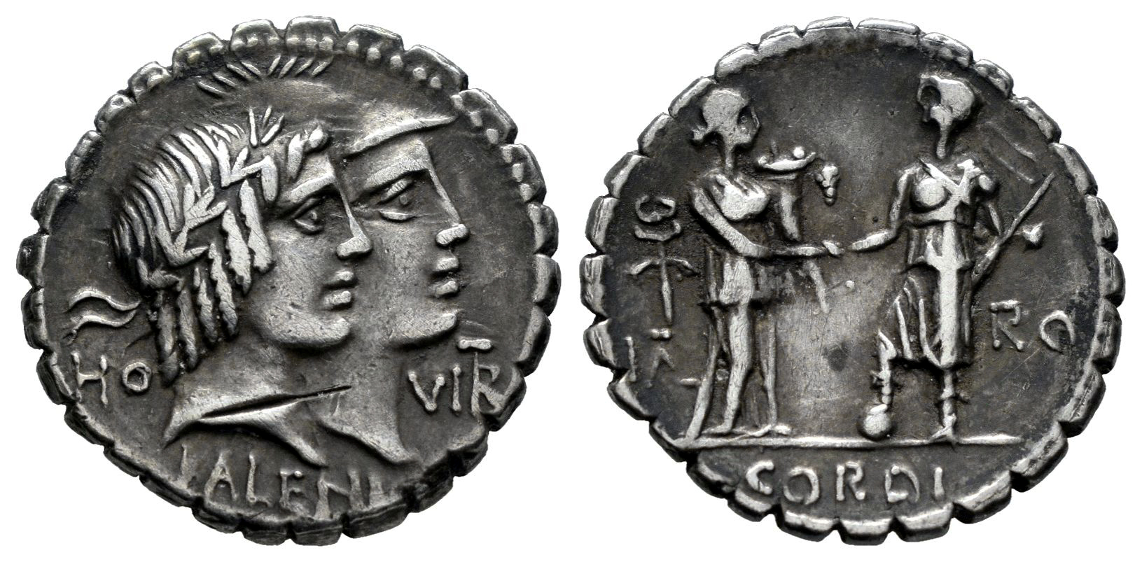 Fufius. Q. Fufius Calenus y Mucius Cordus. Denarius. 70 BC. Uncertain mint in Italy (Rome?). (Ffc-725). (Craw-403/1). (Cal-595). Anv.: KALENI below jugate heads of Honos and Virtus, the former is laureate and the latter wears helmet, HO., behind, VIRT., (RT interlace), before. Rev.: Italia on left and Roma on right, clasping hands, between clasped hands, comucopiae, behind Italia, caducous, Roma wears diadem, holds fasces in left hand and places right foot on globe, RO on right, ITAL., (monogram) on Ieft. CORDI. in exergue. Ag. 4,10 g. Nice patina and well-centered struck. Obverse banker mark. Almost XF/Choice VF. Est...250,00.