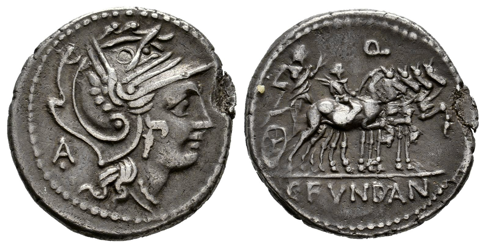 Fundanius. C. Fundanius. Denarius. 101 BC. Rome. (Ffc-727). (Craw-326/1a). (Cal-597). Anv.: Head of Roma right, letter A on dot behind. Rev.: Male figure (¿Marius?) in walking quadriga right, youth on nearest horses, holding laurelbranch in left hand and staff in right hand, Q above, C. FVNDAN., in exergue. Ag. 3,91 g. Slight patina. Choice VF. Est...150,00.