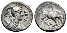 Hosidius. C. Hosidius C.f. Geta. Denarius. 68 BC. South of Italy. (Ffc-751). (Craw-407/2). Anv.: Diademed head of Diana draped right, (but bigger bust, with hair and different adornment in the neck), bow and quiver at her shoulder GETA before, III. VIR behind. Rev.: The wild boar of Calydon right, pierced by spear and attacked by dog. C. HOSIDI. C.F. in exergue. Ag. 4,00 g. Light obverse tone. Traces of luster. Slightly oxidation. Attractive. Scarce in this grade. XF. Est...500,00.