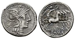 Maenius. Publius Maenius AntiADus. Denarius. 132 BC. Rome. (Ffc-831). (Craw-249/1). (Cal-916). Anv.: Head of Roma right, X behind. Rev.: Victory in quadriga right, P. MAE. ANT., (MAE y ANT interlace), below horses. ROMA in exergue. Ag. 3,88 g. Choice VF. Est...100,00.