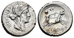 Marcius. L. Marcius Censorinus. Denarius. 88 BC. Rome. (Ffc-884). (Craw-360/1b). (Cal-953). Anv.: L. CENSORIN behind diademed and veiled bust of Venus right. Rev.: Venus in biga, number CX above, C. LIMETA., (TA interlace), below horses. P. CREPVSI in exergue. Ag. 4,00 g. Magnificent piece. Most of original luster. Slight tone in reverse. Very rare in this grade. AU. Est...500,00.