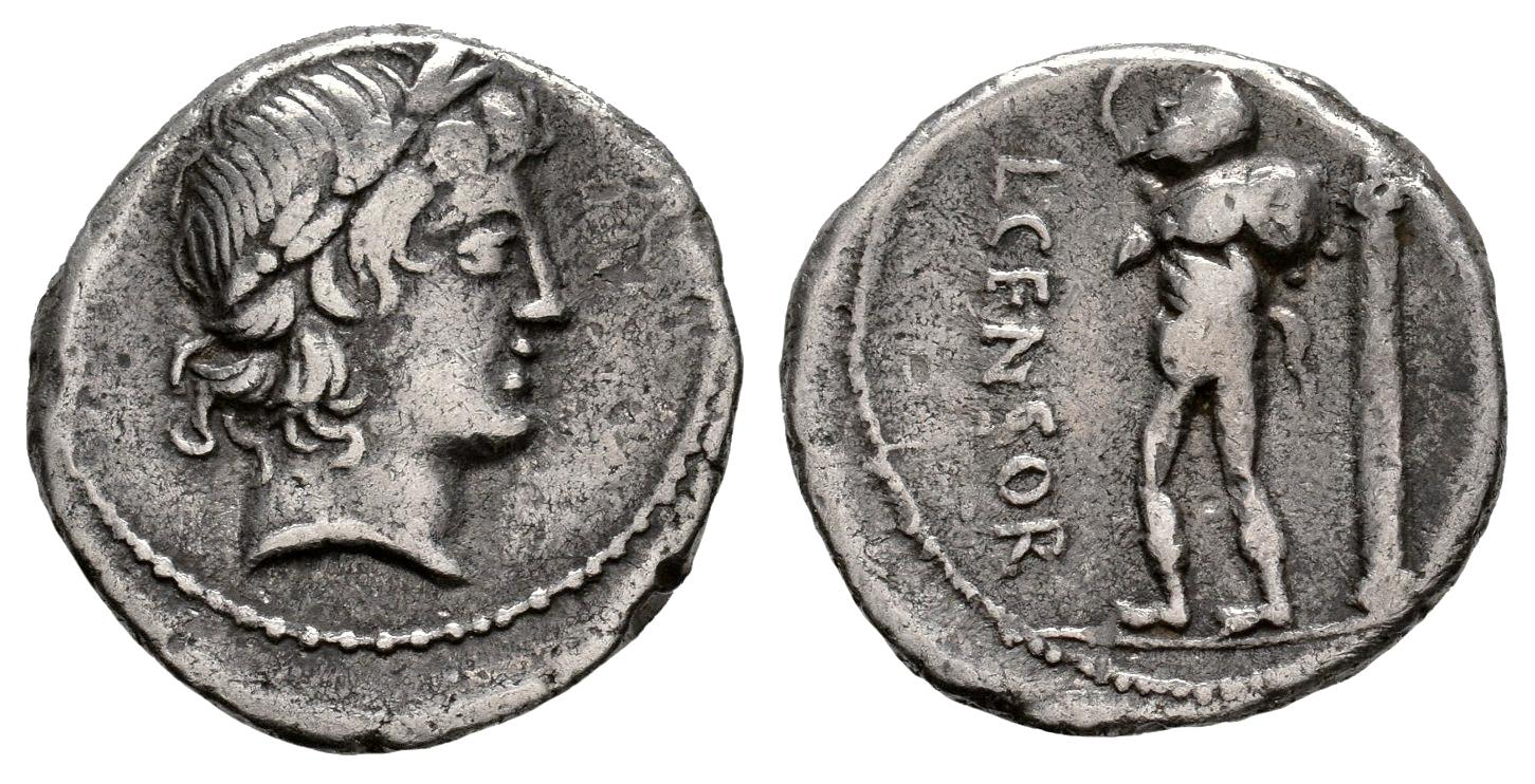 Marcius. L. Marcius Censorinus. Denarius. 88 BC. Rome. (Ffc-888). (Craw-363/1d). (Cal-957). Anv.: Laureate head of Apollo right. Rev.: L. CENSOR before the satyr, Marsyas, standing Ieft with wine-skin on shoulder; behind him, column surmounted by draped figure (Minerva?). Ag. 3,68 g. VF. Est...75,00.