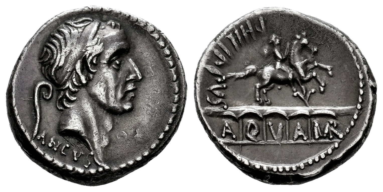 Marcius. C. Marcius Philippus. Denarius. 56 BC. Rome. (Ffc-894). (Craw-425/1). (Cal-962). Anv.: ANCVS below diademed head of Ancus Marcius right, lituus behind. Rev.: PHILIPPVS behind equestrian statue right on an arcade of five arches within A.Q.V.A. MAR. (MAR monogram), flower below horses. Ag. 4,00 g. Slight patina. Minor scratches on obverse. Very attractive. Almost XF/XF. Est...250,00.