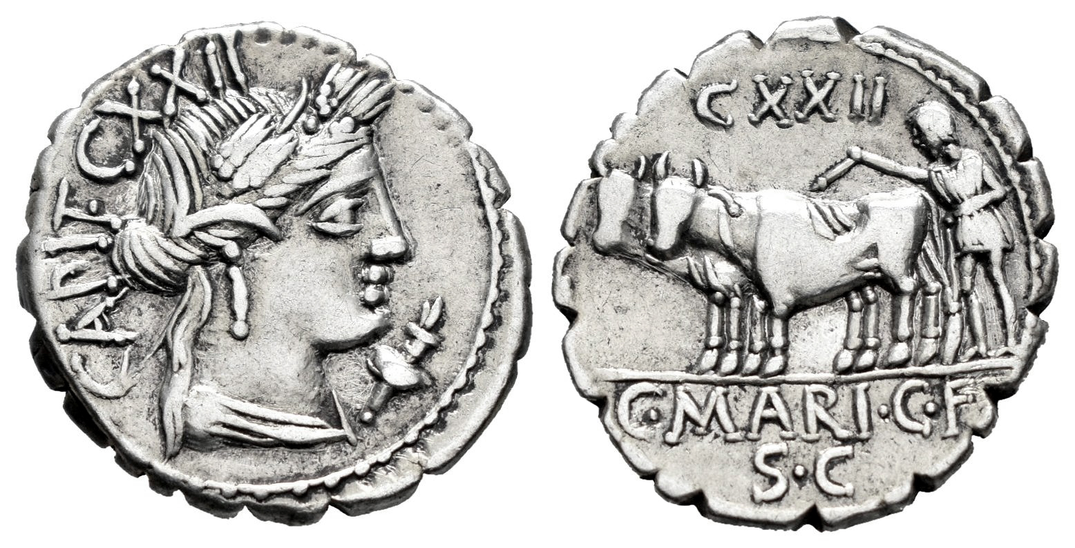 Marius. C. Marius C.f. Capito. Denarius. 81 BC. Auxiliary mint of Rome. (Ffc-901). (Craw-378/1c). (Cal-968). Anv.: CAPIT followed by number CXXII behind draped bust of Ceres right, head bound with corn-wreath, torch before. Rev.: Husbandman left, ploughing with yoke of oxen, same number CXXII above, C. MARI. C.F./ S.C. in exergue. Ag. 3,89 g. Almost XF/Choice VF. Est...200,00.
