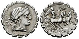 Naevius. C. Naevius Balbus. Denarius. 79 BC. Auxiliary mint of Rome. (Ffc-937). (Craw-382/1b). (Cal-1041). Anv.: Diademed head of Venus right, S.C. behind. Rev.: Victory in triga right, number CXXX above, C. NAE. BALB., (AE y AL interlace). Ag. 3,82 g. Very well-centered struck. Choice VF. Est...150,00.