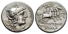 Opeimius. L. Opeimius. Denarius. 131 BC. Rome. (Ffc-949). (Craw-253/1). (Cal-1055). Anv.: Head of Roma right, below chin, wreath behind. Rev.: Victory in quadriga right, holding reins in left hand and wreath in right hand, L. OPEIMI, below horses. ROMA in exergue. Ag. 2,37 g. Choice VF. Est...100,00.