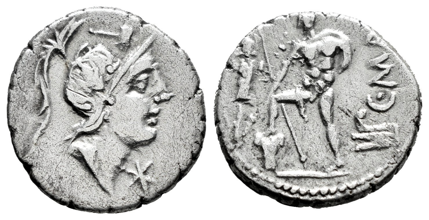 Poblicius. Caius Poblicius Malleolus. Denarius. 91 BC. Auxiliary mint of Rome. (Ffc-1012). (Craw-335/3b). (Cal-1139). Anv.: Head of Mars right, feather on helmet, mallet (malleolus) above, X below chin. Rev.: A warrior or hero standing Ieft before trophy, foot on cuirass, prow and C. MAL. (AL interlace), upwars behind. Ag. 3,74 g. Minor hairlines. VF. Est...150,00.
