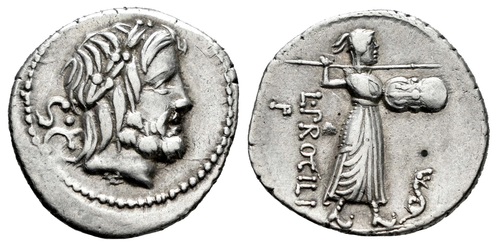Procilius. L. Procilius f. Denarius. 80 BC. Rome. (Ffc-1083). (Craw-379/1). (Cal-1226). Anv.: Laureate head of Jupiter right, S.C. behind. Rev.: Juno Sospita walking right, hurling spear and holding shield, serpent erect before. L. PROCILI. / F. behind. Ag. 3,92 g. Choice VF. Est...150,00.