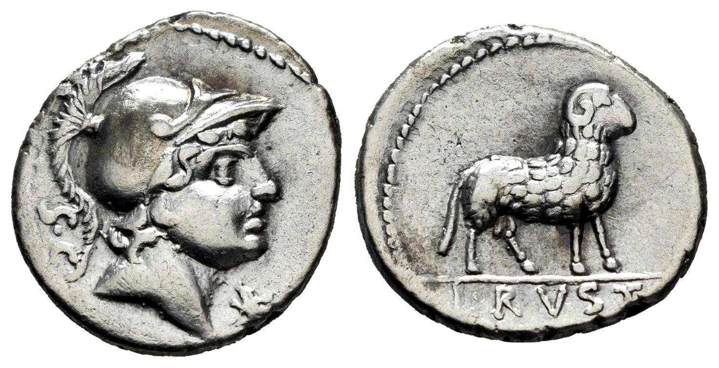 Rustius. L. Rustius. Denarius. 76 BC. Rome. (Ffc-1094). (Craw-389/1). (Cal-1235). Anv.: Head of young Mars right, S.C. behind, X below chin. Rev.: Ram standing right, L. RVSTI. in exergue. Ag. 3,82 g. Cleaned. Choice VF. Est...150,00.