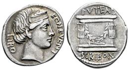 Scribonius. L. Scribonius Libo. Denarius. 62 BC. Rome. (Ffc-1102). (Craw-416/1a). (Cal-1248). Anv.: BON. EVENT before diademed head of Bonus Eventus right, LIBO behind. Rev.: PVTEAL above well-head ornamented with two lyres, hammer and festoons, SCRIBON., in exergue. Ag. 3,92 g. Delicate patina. Lightly toned. Choice VF. Est...120,00.