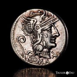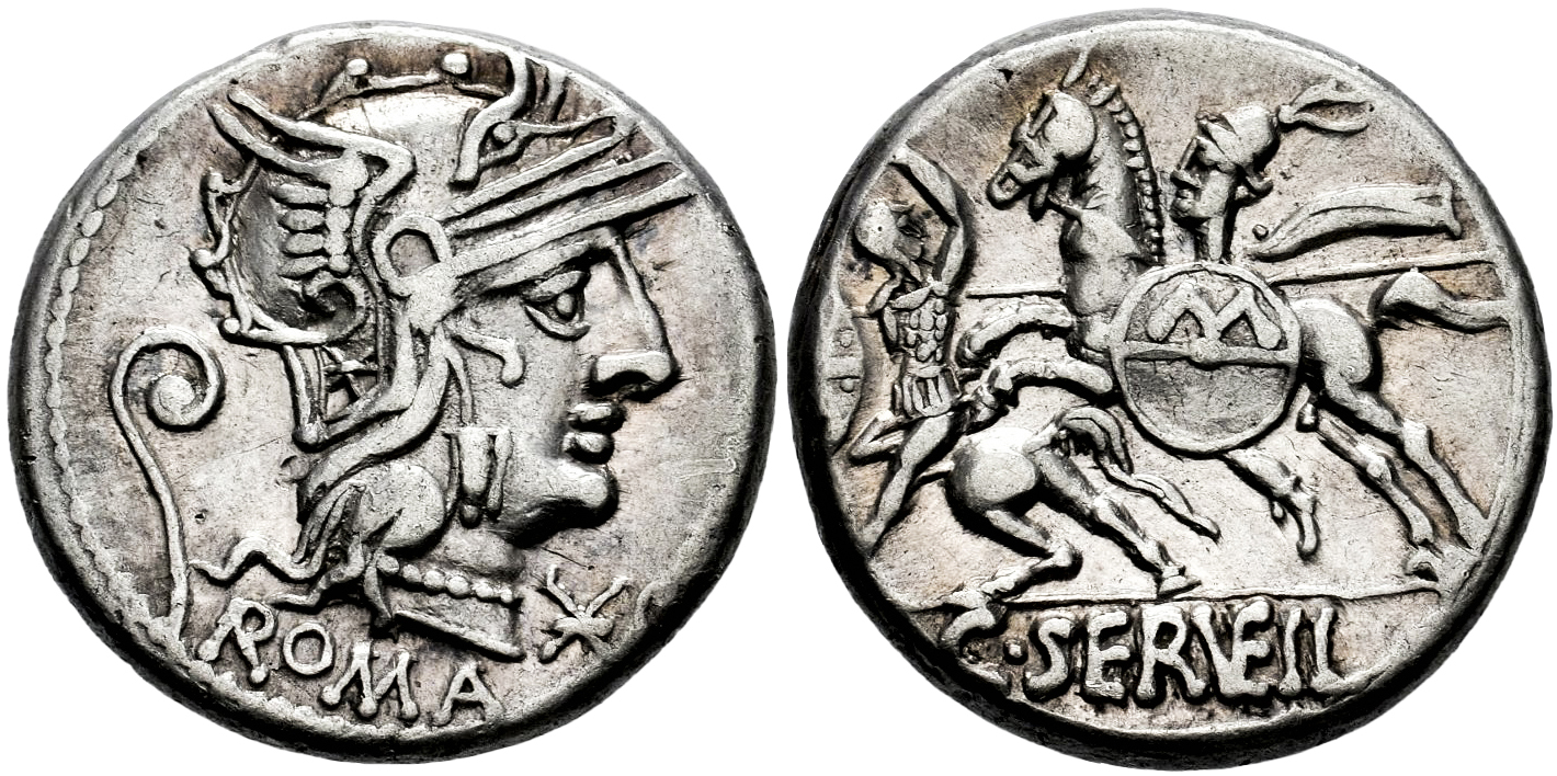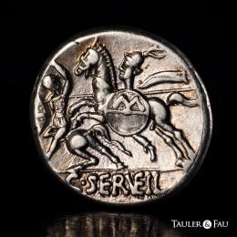 Servilius. Caius Serveilius. Denarius. 127 BC. Rome. (Ffc-1114). (Craw-264/1). (Cal-1274). Anv.: Head of Roma right, X below chin, lituus behind. ROMA below, star on neck-piece of Roma’s helmet. Rev.: Horseman, with shield inscribed M, galloping left and piercing with spear another horseman before him. C. SERVEIL (VE interlace) in exergue. Ag. 3,91 g. Attractive specimen. Ex Numismatica Ars Classica 100 (29/05/2017), lot 1409. Included original label. Almost XF. Est...250,00.
