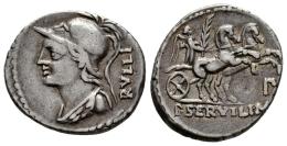 Servilius. P. Servilius M.f. Rullus. Denarius. 100 BC. Norte de Italia. (Ffc-1118). (Craw-328/1). (Cal-1277). Anv.: Bust of Minerva Ieft, wearing crested helmet and aegis, RVLLI. behind. Rev.: Victory in biga right, P below horses, P. SERVILI. M.F. in exergue. Ag. 3,87 g. VF. Est...90,00.