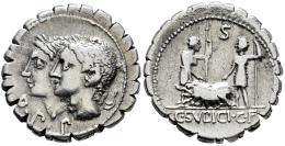 Sulpicius. C. Sulpicius C.f. Denarius. 106 BC. Rome. (Ffc-1133). (Craw-312/1a). (Cal-1288). Anv.: Laureate heads of the Dei Penates conjoined left, D.P.P. before. Rev.: Two soldiers swearing oath over sow, letter above, C. SVLPICI. C.F. (LP interlace), in exergue. Ag. 4,00 g. Slightly cleaned. Choice VF/VF. Est...150,00.