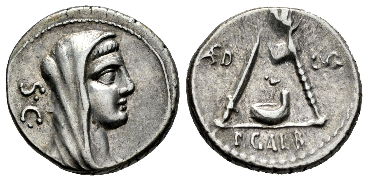 Sulpicius. P. Sulpicius Galba. Denarius. 69 BC. Rome. (Ffc-1134). (Craw-406/1). (Cal-1289). Anv.: Veiled head of Vesta right, S.C. behind. Rev.: Knife, simpulum and ornamented axe, AED-CVR (AE interlace), in field, P. GALB. in exergue. Ag. 3,90 g. Attractive specimen. Slight patina. Traces of luster. Almost XF. Est...250,00.