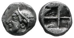 Ionia. Phokaia. Diobol. 521-478 BC. (Klein-452). (Sng Cop-389/393). (Sng von Aulock-1815). Anv.: Head of nymph to left, wearing sakkos adorned with central band, and rosette earring. Rev.: Quadripartite incuse square. Ag. 1,13 g. VF. Est...60,00.