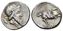 Titius. Q. Titius. Denarius. 90 BC. Central Italy. (Ffc-1142). (Craw-341/1). (Cal-1301). Anv.: Head of Mutinus Titinus right, bound with winged diadem. Rev.: Q. TITI., on tablet from which springs Pegasus right. Ag. 4,06 g. Sligthly iridiscent tone. Choice VF/Almost XF. Est...180,00.