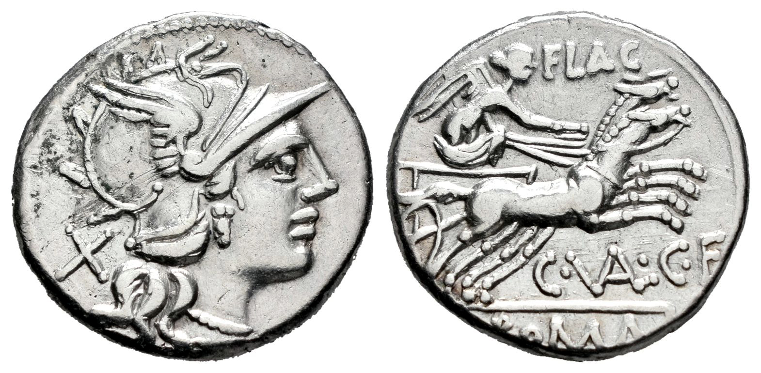 Valerius. C. Valerius C.f. FlADcus. Denarius. 140 BC. Rome. (Ffc-1163). (Craw-228/2). (Cal-1320). Anv.: Head of Roma right, X behind. Rev.: Victory in biga right, FLAC above, C. VAL. C. F., (VAL interlace) below horses, ROMA in exergue. Ag. 4,04 g. Cleaning hairlines on obverse. Choice VF. Est...120,00.