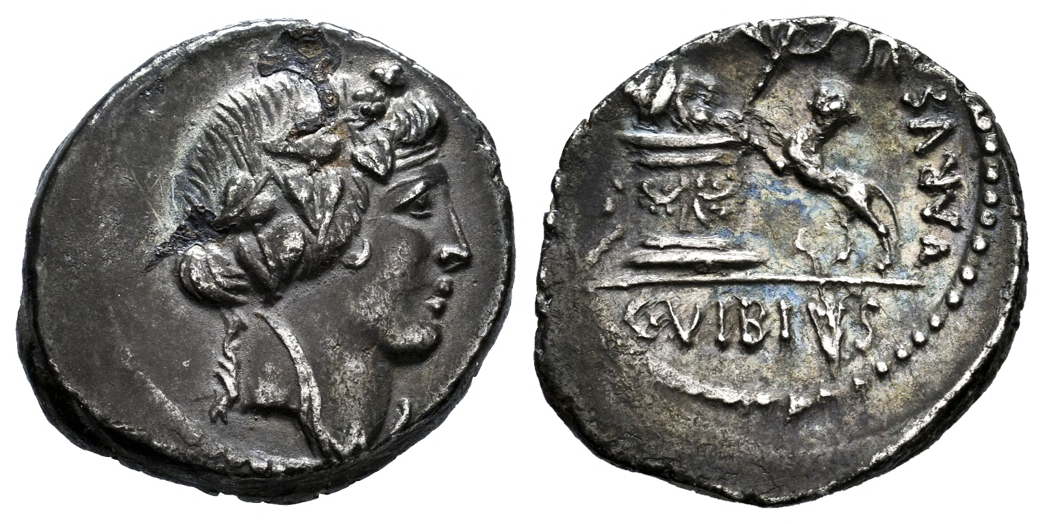 Vibius. C. Vibius Varus. Denarius. 42 BC. Rome. (Ffc-1227). (Craw-494/36). (Cal-1378). Anv.: Head of Bacchus right, wearing wreath of ivy and grapes. Rev.: Panther springing left towards garlanded altar on which thyrsus and mask, C. VIBIVS. in exergue, VARVS on right. Ag. 3,96 g. Beautiful monetary patina with iridescent tones. Choice VF/Almost XF. Est...250,00.