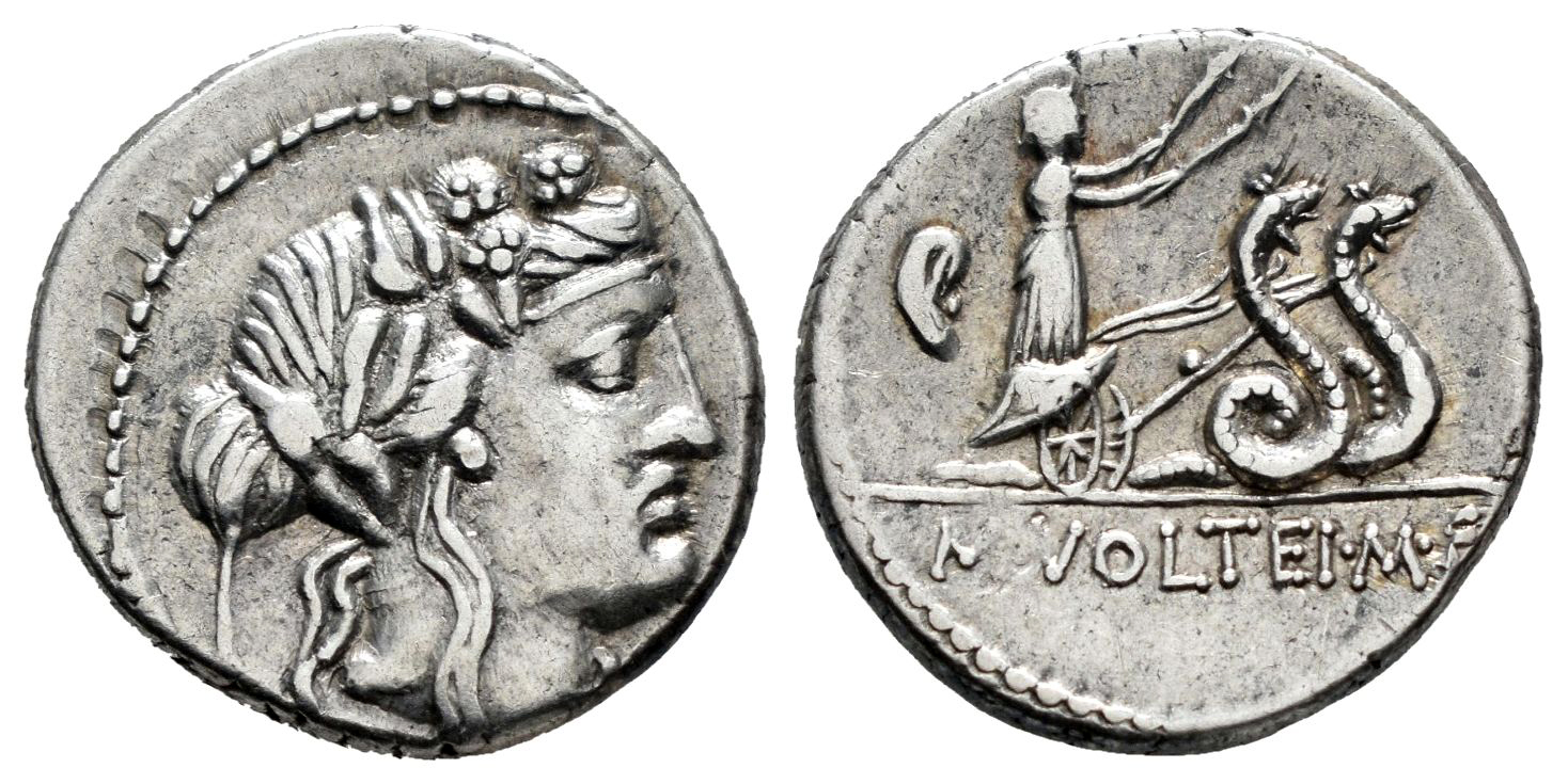 Volteius. M. Volteius M.f. Denarius. 78 BC. Rome. (Ffc-1231). (Craw-385/5). (Cal-1393). Anv.: Head of Liber or Bacchus right, wearing ivy-wreath. Rev.: Ceres in chariot right, drawn by two serpents, ear behind, M. VOLTEI. M. F. in exergue. Ag. 3,88 g. Choice VF. Est...150,00.