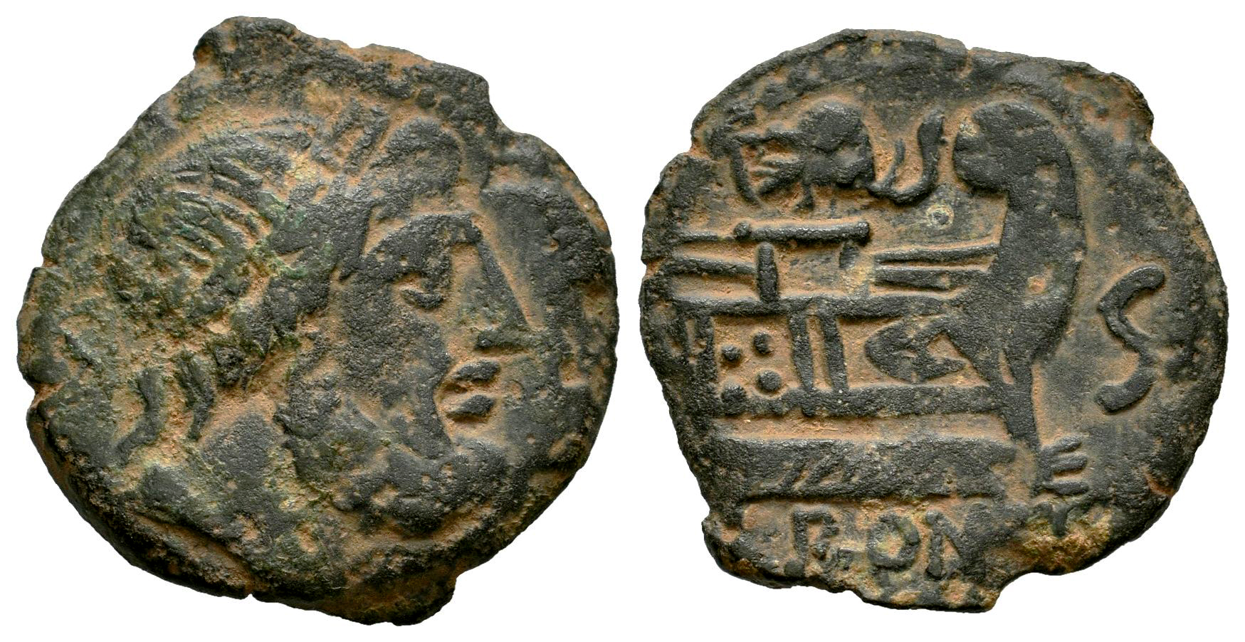 Elephant Head Series. Half unit. 128 BC. Rome. (Craw-262/2). (RBW-1061). (BMCRR-Rome 1048/50). Anv.: Laureate head of Saturn to right; S (mark of value) behind. Rev.: Prow to right; elephant head above, S (mark of value) before; ROMA below. Ae. 5,03 g. Scarce. VF/Choice VF. Est...150,00.
