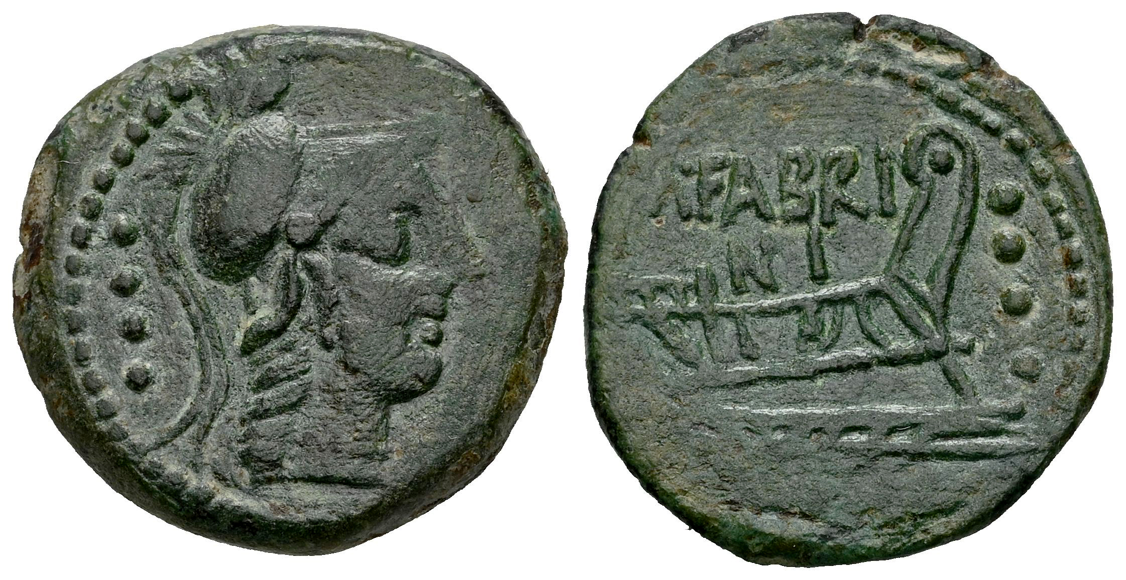 M. Fabrinius. Triens. 132 BC. Rome. (Craw-251/2). (Sydenham-453a). (RBW-1032). Anv.: Helmeted head of Minerva to right; •••• (mark of value) behind. Rev.: Prow of galley to right; M•FABRI NI above, •••• (mark of value) in right field, ROMA in exergue. Ae. 4,49 g. Beautiful green patina. Rare. Ex Num. Varesi 75 (12/11/2019), lot 43. Choice VF. Est...150,00.