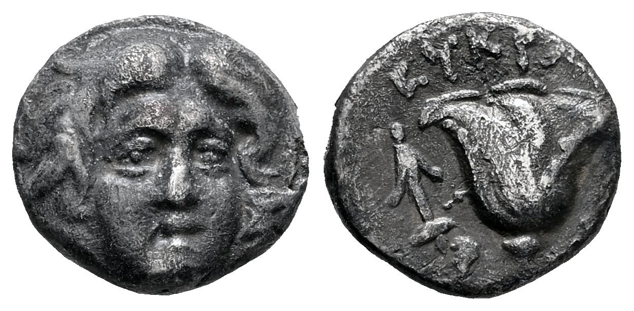 Islands of Caria. Rhodos, Rhodes. Hemidrachm. 229-205 BC. Eukrates magistrate. (Ashton-226). (HN Online-851). (Hgc-6, 1448). Anv.: Head of Helios facing slightly right. Rev.: Rose with bud to right; anchor to left, EΥKΡATHΣ above; P-O below. Ag. 1,12 g. Patina. Ex Classical Numismatic Group 565 (03/07/2024), lot 167. Included original label. VF. Est...100,00.