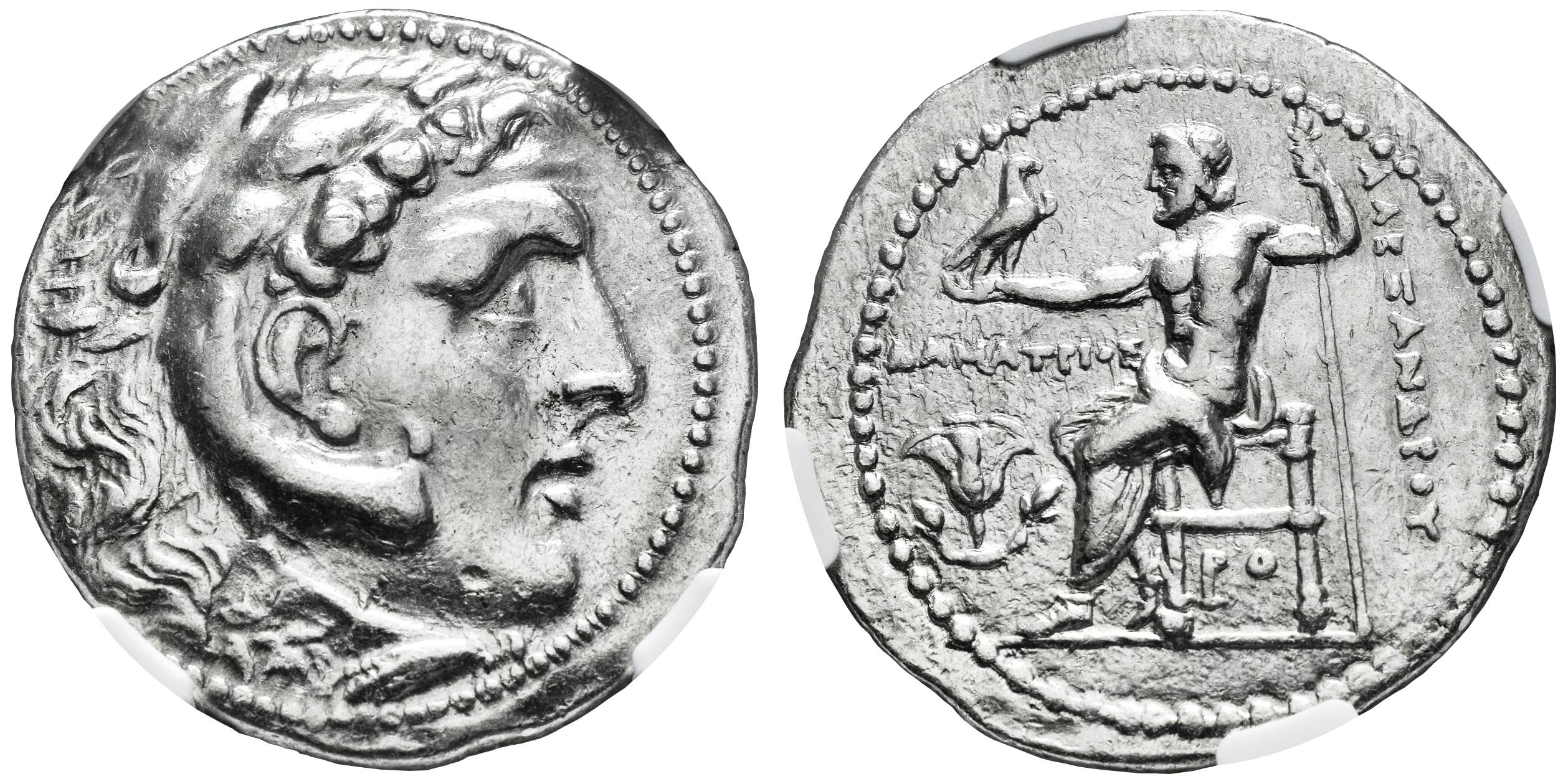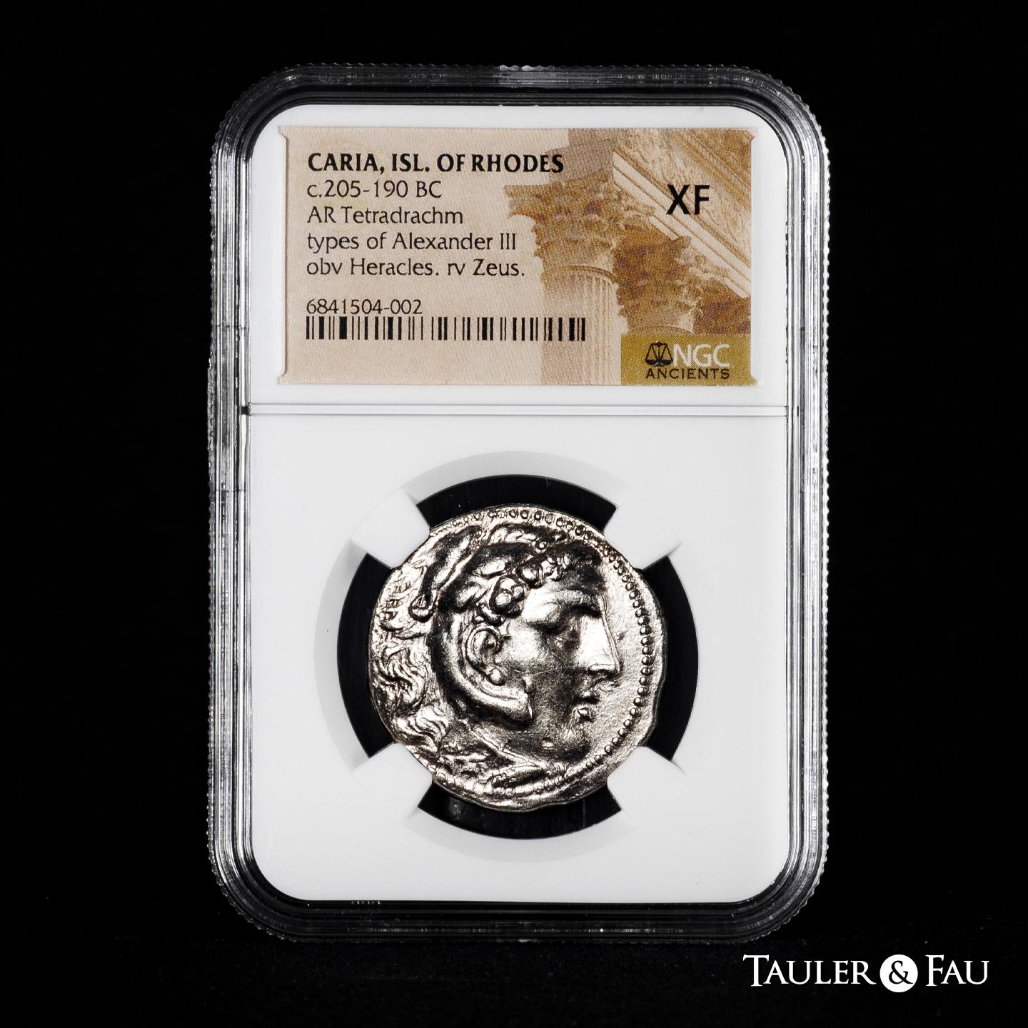 Kingdom of Macedon. In the name and types of Alexander III of Macedon. Tetradrachm. 201-190 BC. Rhodos, Rhodes. Damatrios Magistrate. (Price-2521). (Hgc-6, 1455). Anv.: Head of Herakles to right, wearing lion skin headdress. Rev.: Zeus Aëtophoros enthroned to left, holding sceptre; AΛEΞANΔPOY to right, ΔAMATPIOΣ and rose in left field, PO under throne. Ag. Slabbed by NGC as XF. NGC-XF. Est...1000,00.